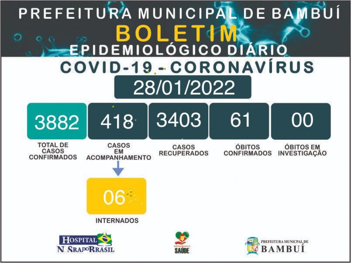 A Prefeitura de Bambuí, por meio da Secretaria Municipal de Saúde, em parceria com o Hospital Nossa Senhora do Brasil, divulgou nesta sexta-feira (28), mais um boletim epidemiológico diário sobre os casos de Covid-19 no município.